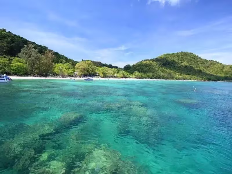 Arrive at Coral Island for relaxing and snorkeling over great coral reefs with colorful fishes.